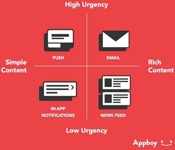 Your mobile application messaging strategy should use all types of message (push notifications, email, in-app notifications, news feed messaging) based on urgency and content.