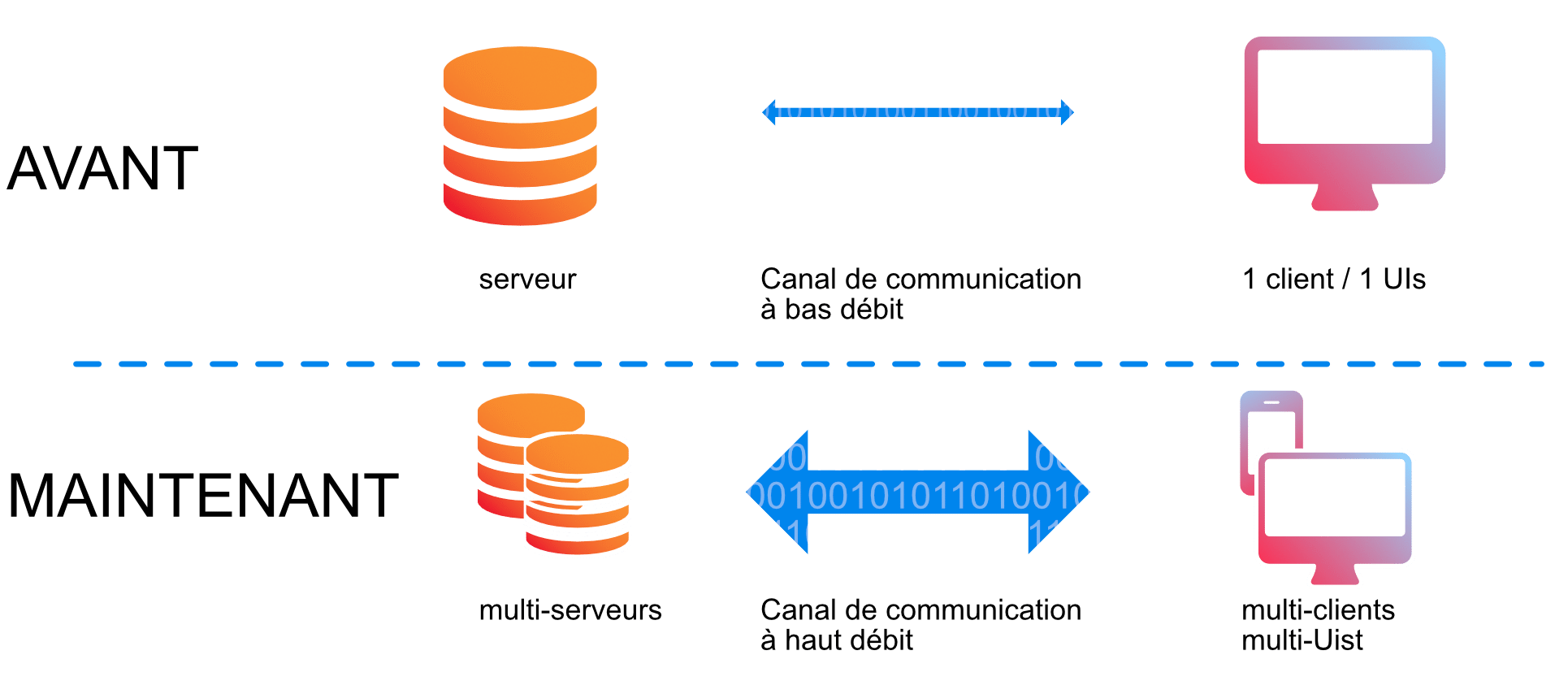 En un mot, ce qui est unique à chaque Client sera codé côté « Client » et tout ce qui est commun à tous les Clients sera codé côté « Serveur ».